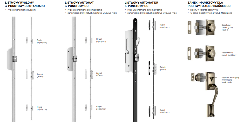 Jeden z najbardziej znanych producentów drzwi w Polsce sporo uwagi poświęca elementom zabezpieczeń takim jak zamek do drzwi i solidna wkładka. Przy zakupie drzwi możesz wybrać takie rozwiązania jak listwowy ryglowy 3-punktowy lub zamek 4-punktowy z jedną wkładką albo dodatkową wkładką górną. Kolejny rygiel z górną wkładką możesz też dobrać do zamku automatycznego 4-punktowego, stosowanego w drzwiach o podwyższonej klasie antywłamaniowości (RC2).